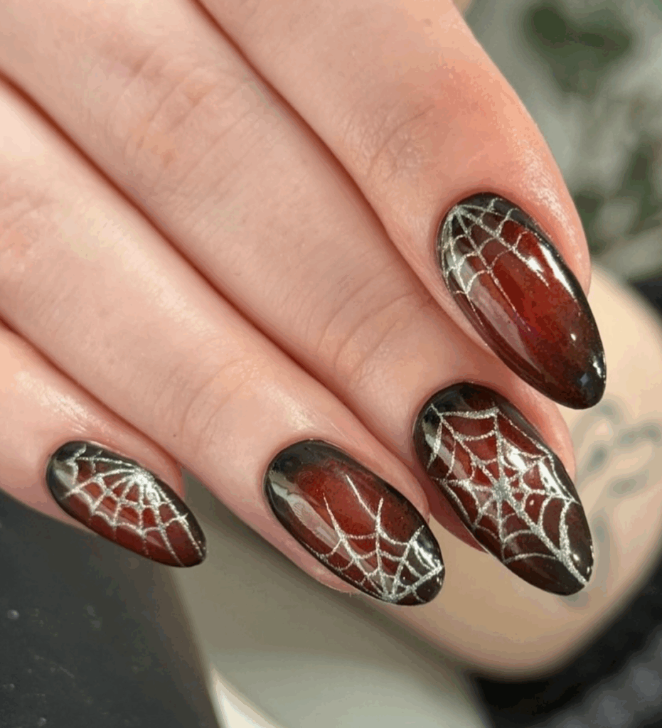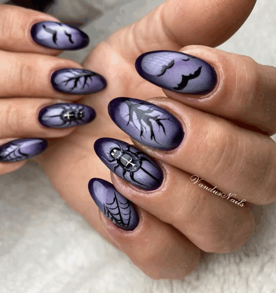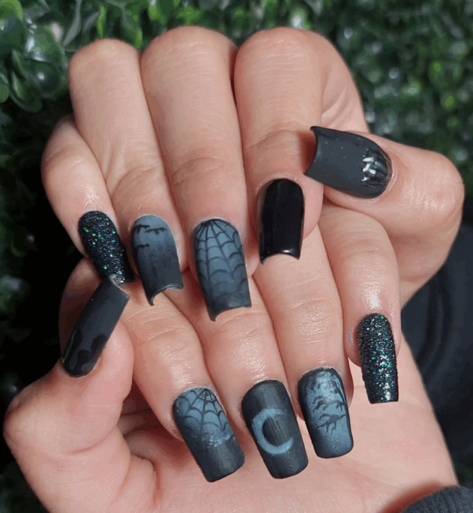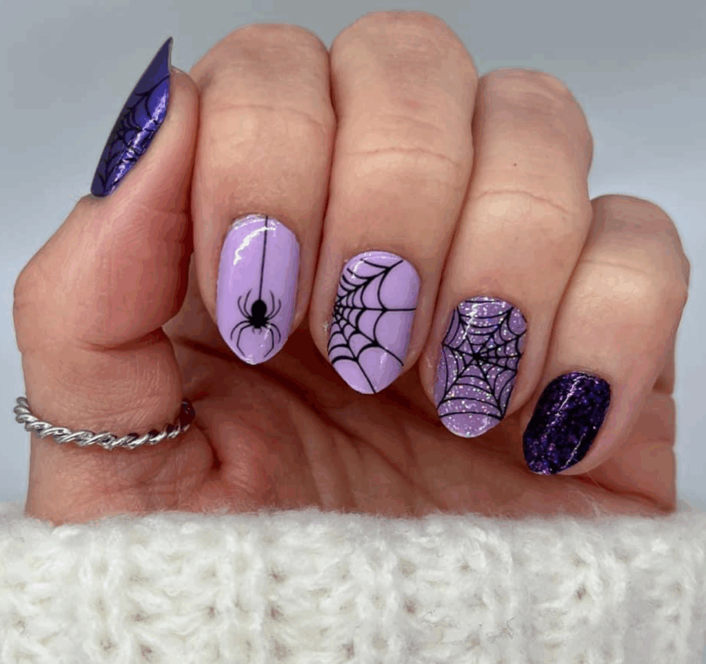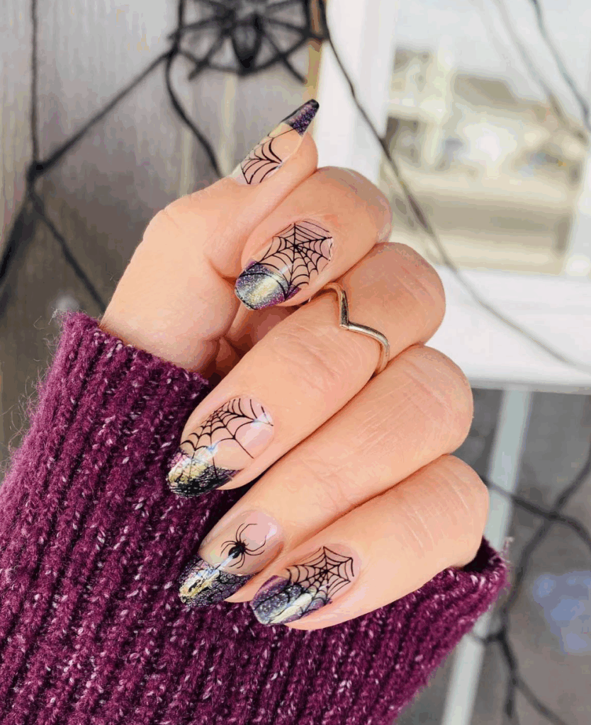 Creepy yet chic, spider and web nails are perfect for Halloween. Pair them with black or silver glitter polish for a mysterious vibe. You can also add some color, because creativity has no bounds.