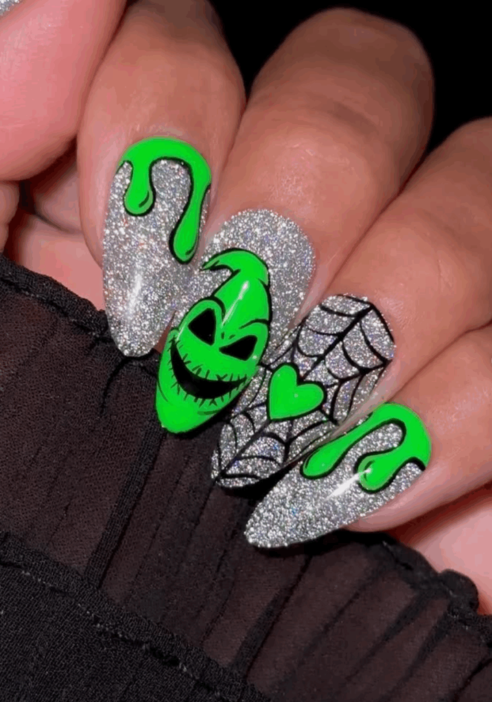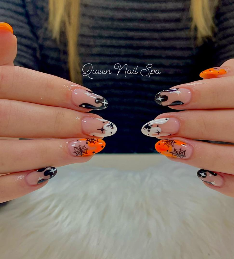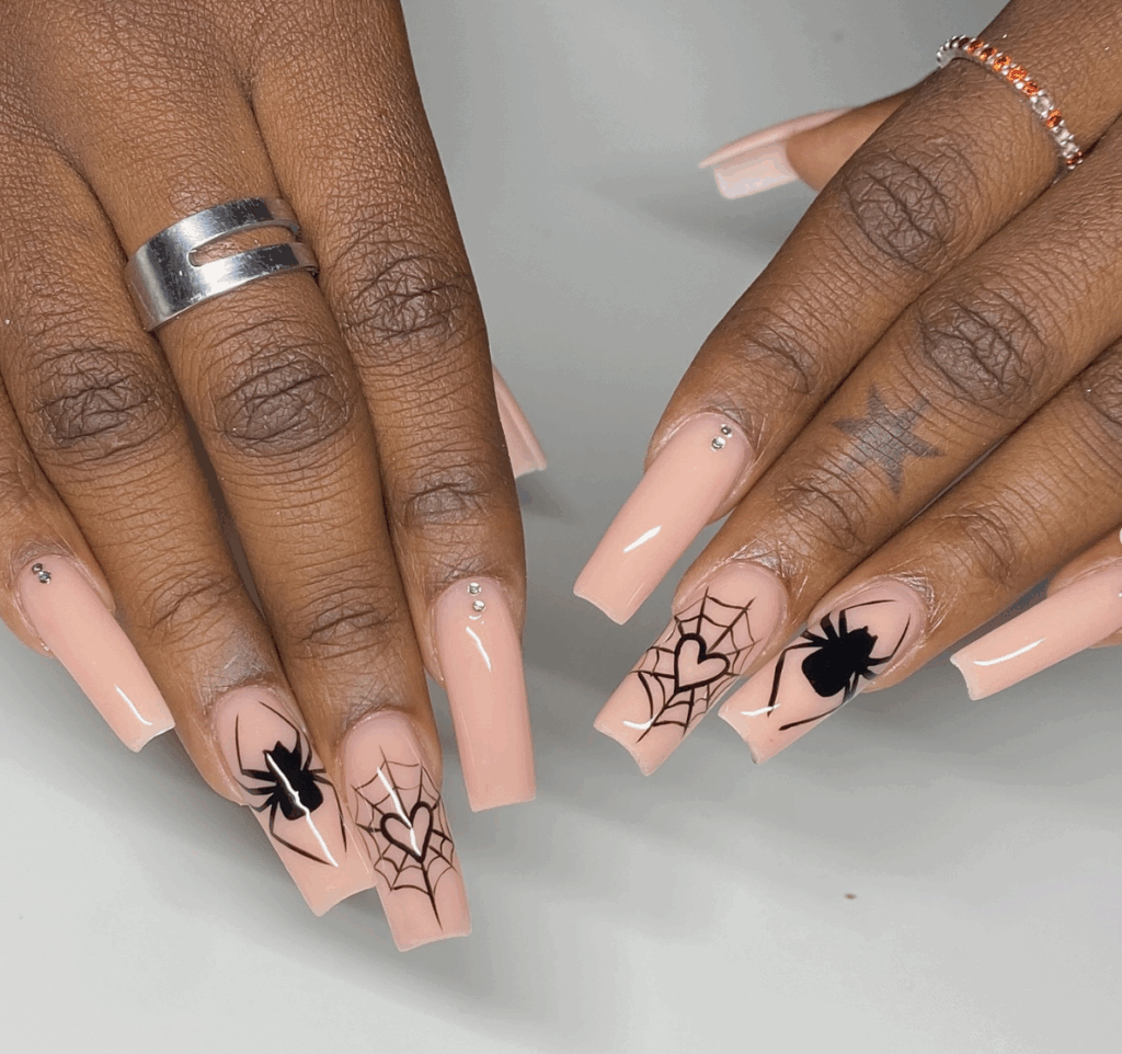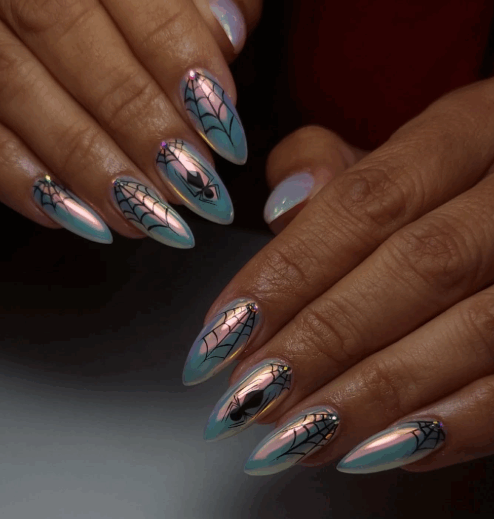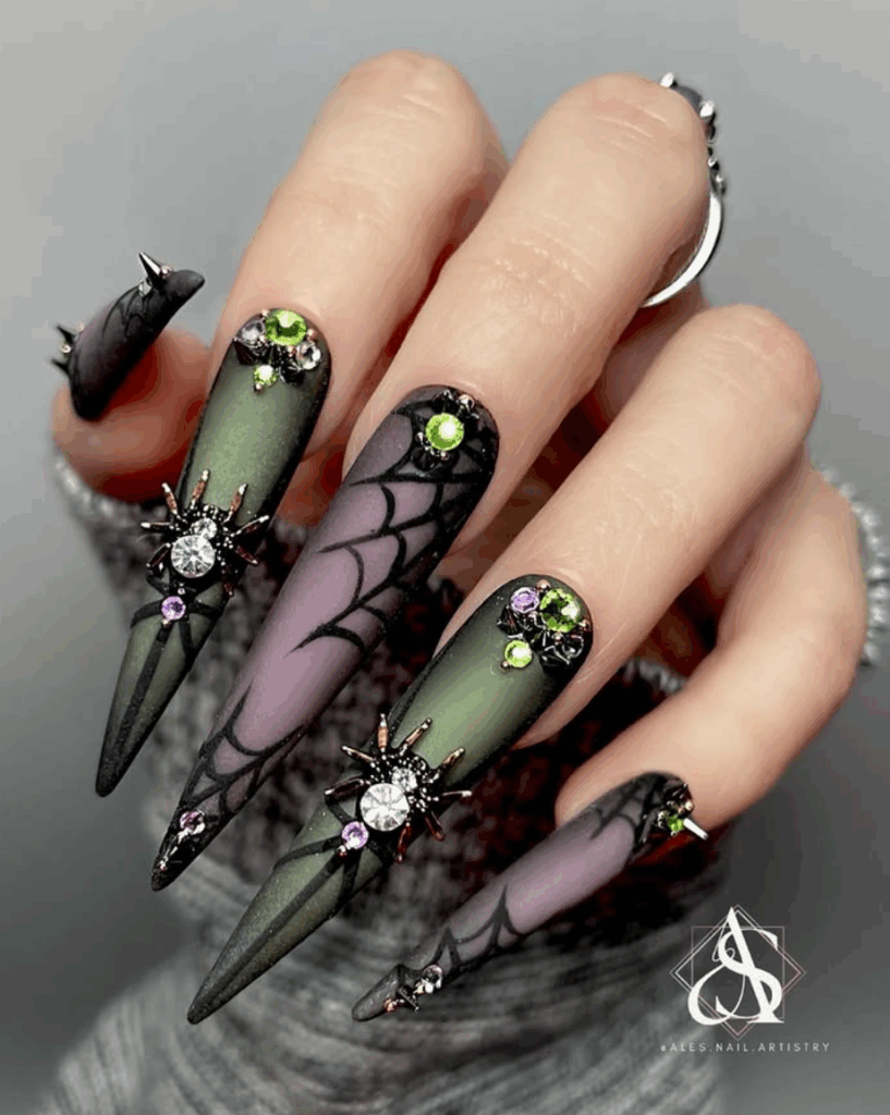Creepy yet chic, spider and web nails are perfect for Halloween. Pair them with black or silver glitter polish for a mysterious vibe. You can also add some color, because creativity has no bounds.