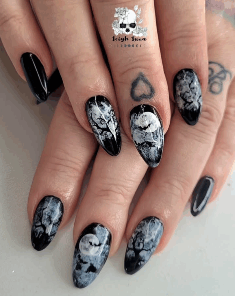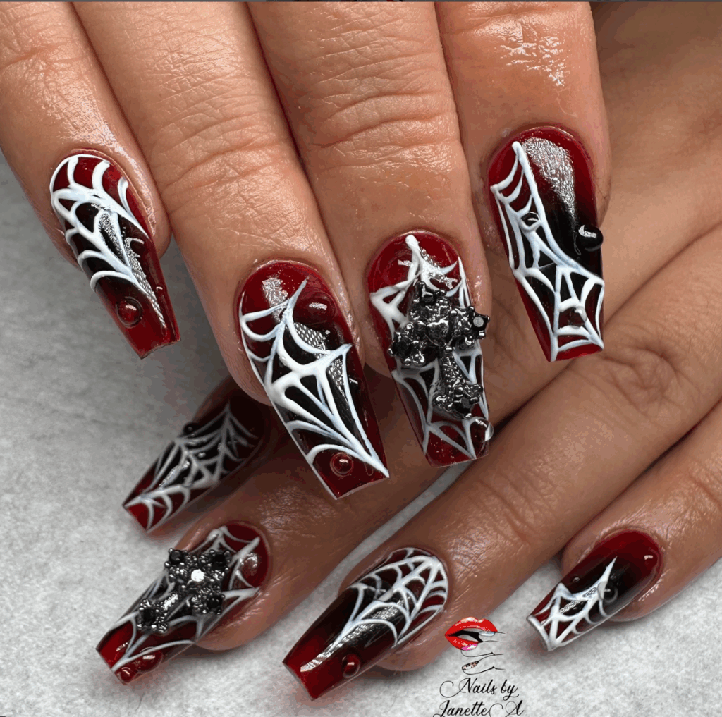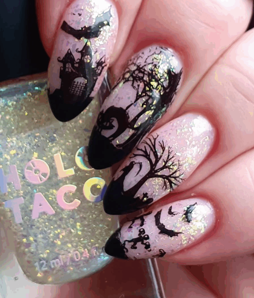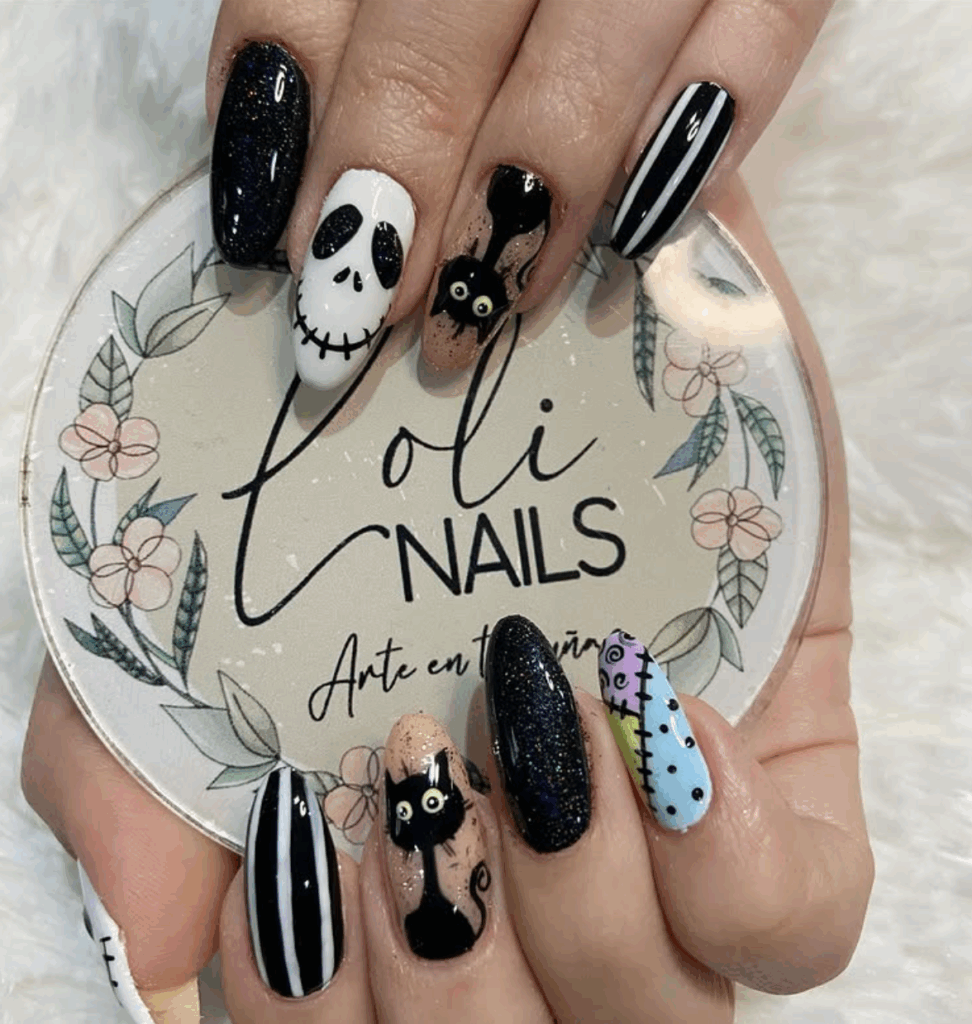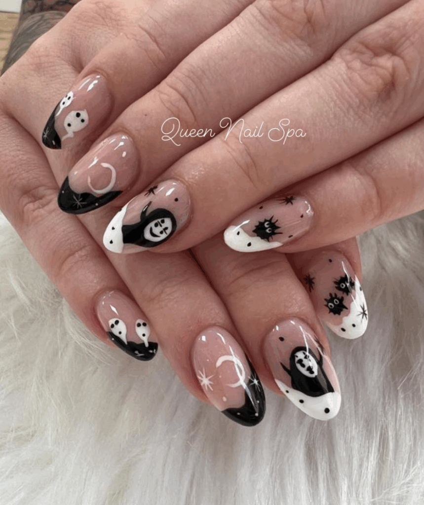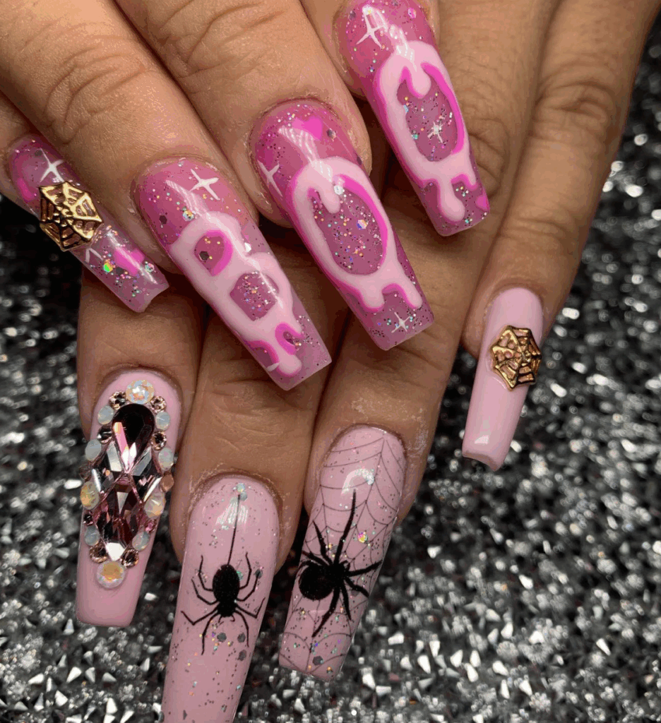 Creepy yet chic, spider and web nails are perfect for Halloween. Pair them with black or silver glitter polish for a mysterious vibe. You can also add some color, because creativity has no bounds.
