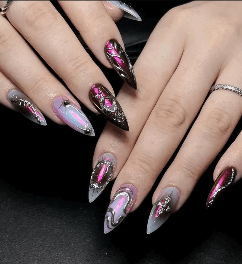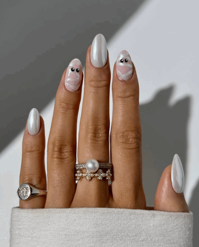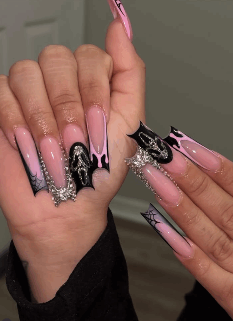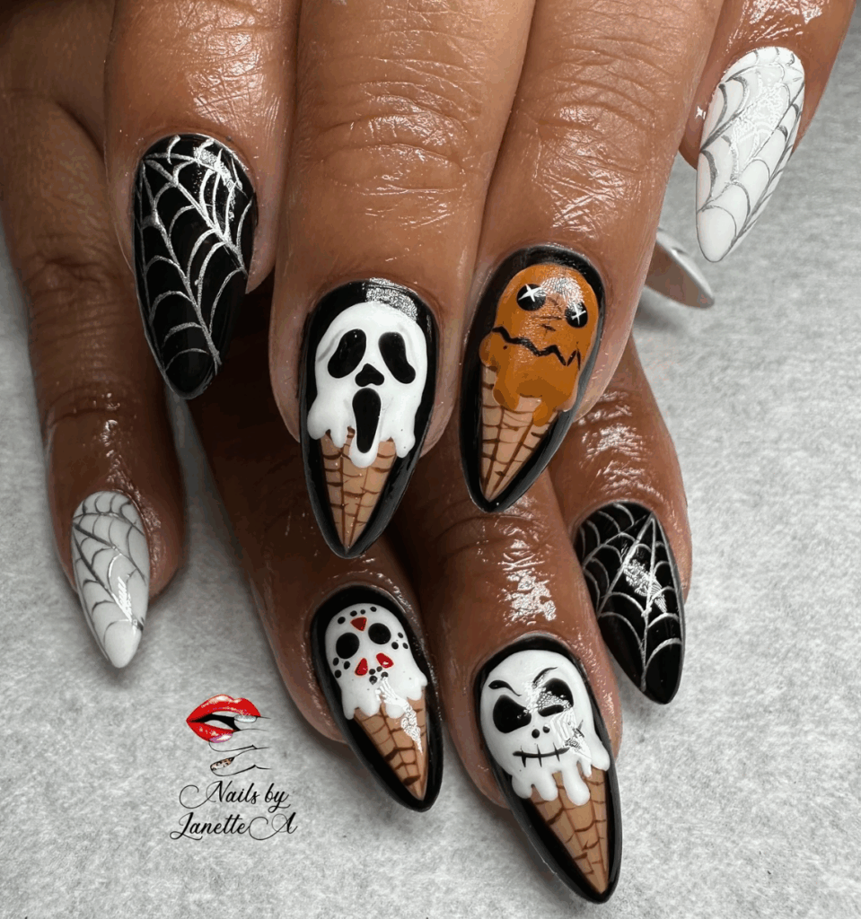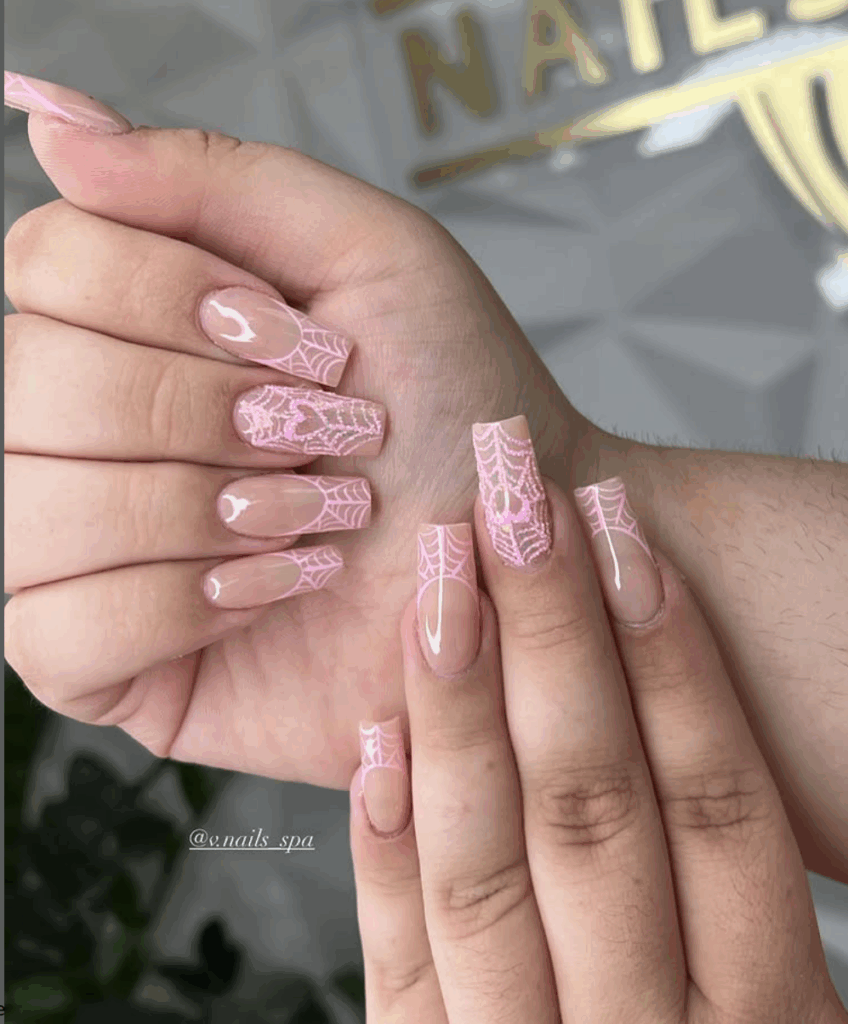 Creepy yet chic, spider and web nails are perfect for Halloween. Pair them with black or silver glitter polish for a mysterious vibe. You can also add some color, because creativity has no bounds.