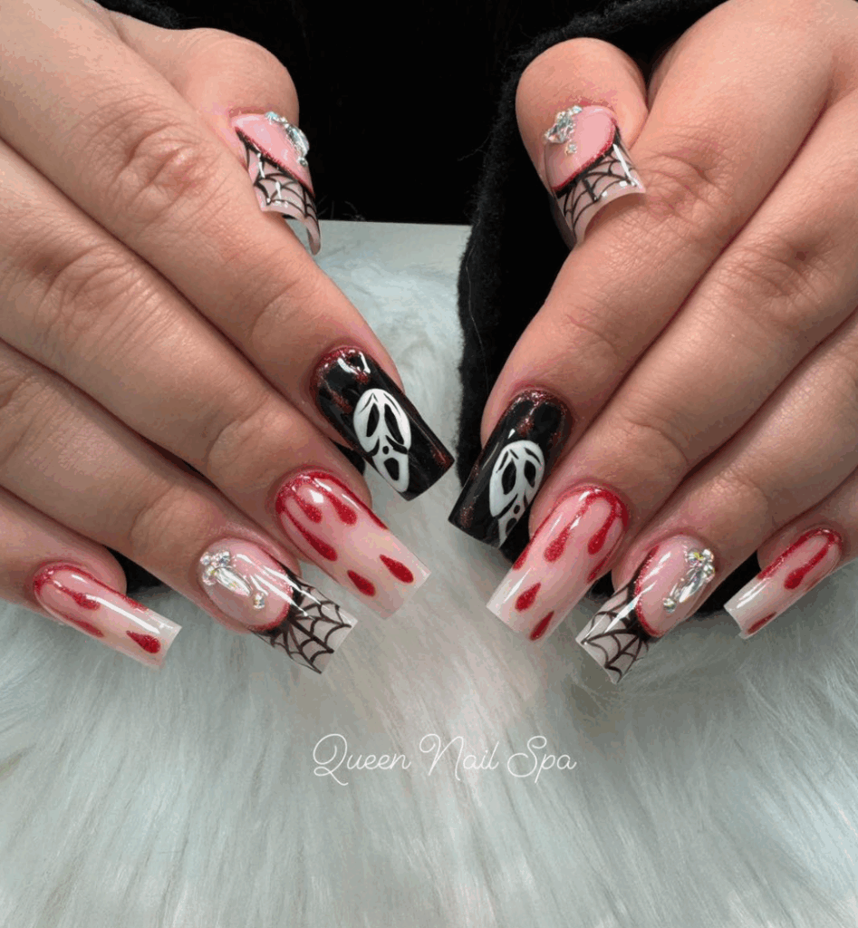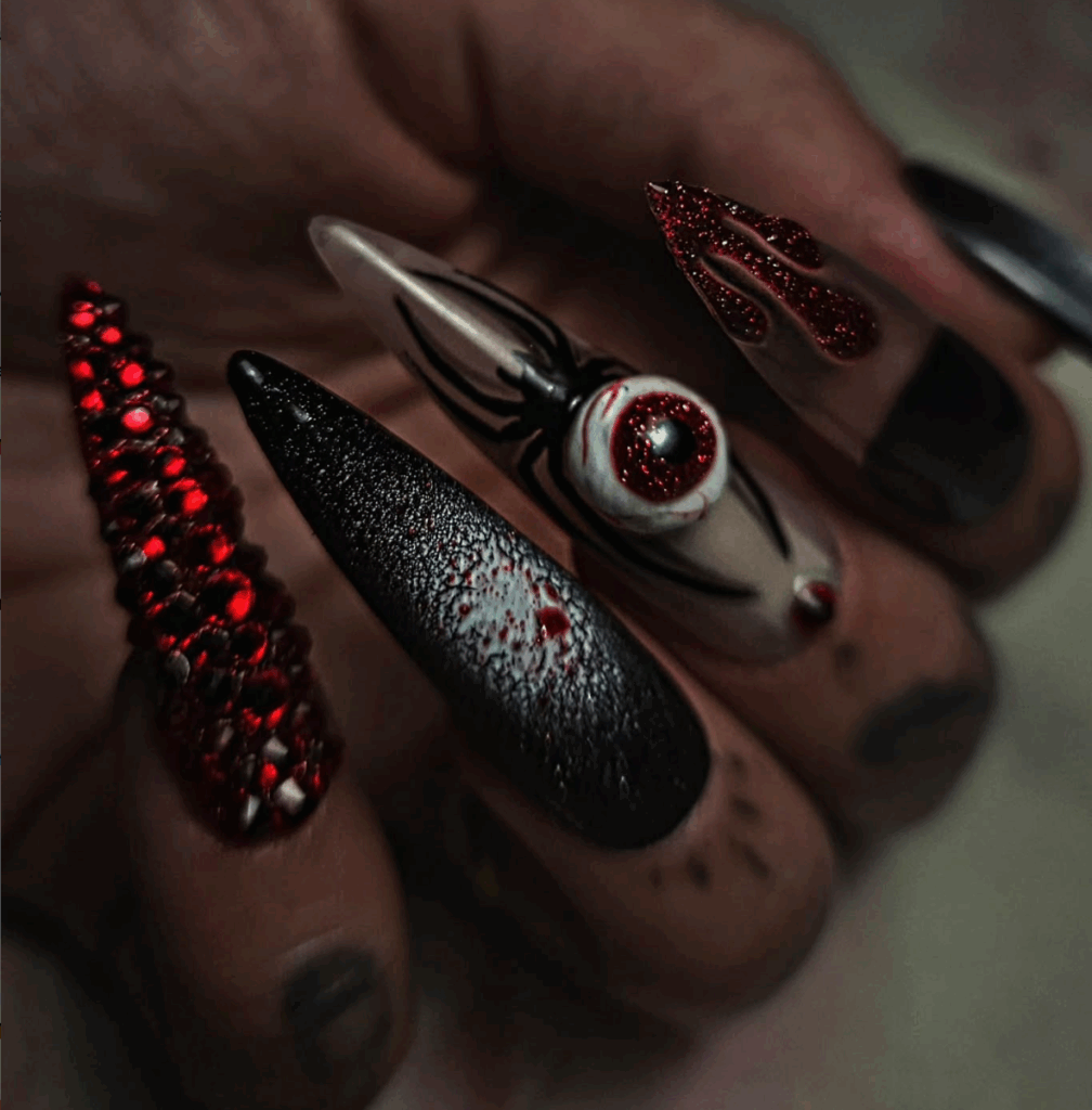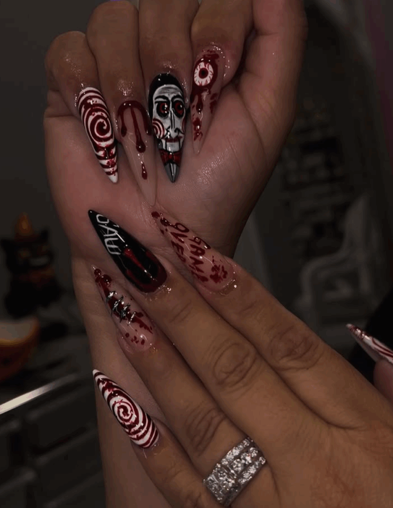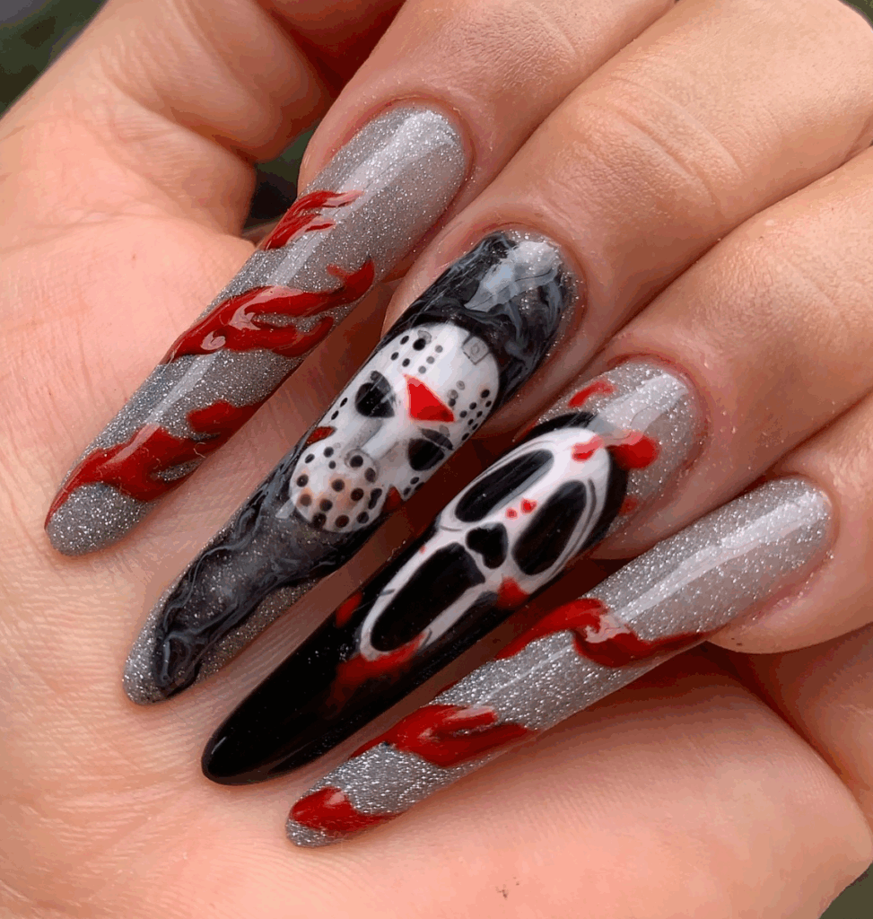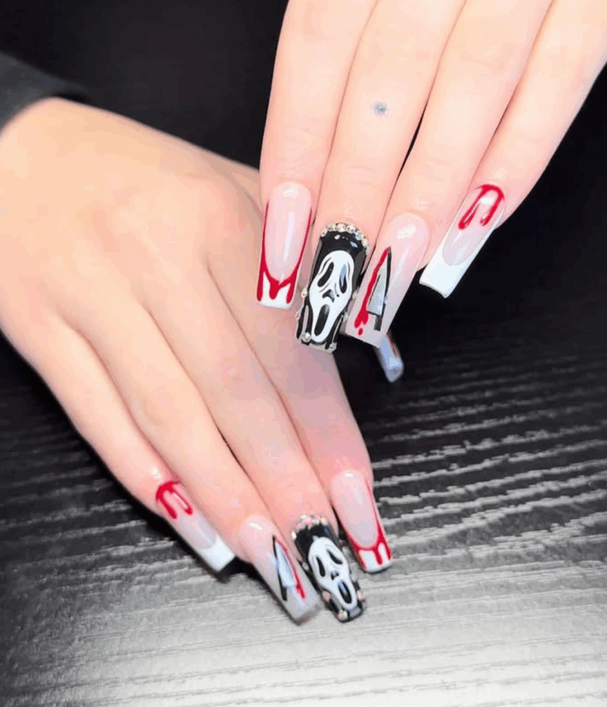 For horror fans, these nails bring the chills. Think skulls, haunted houses, creepy eyes, and red blood-drip designs. They’re bold, dramatic, and perfect for Halloween parties.