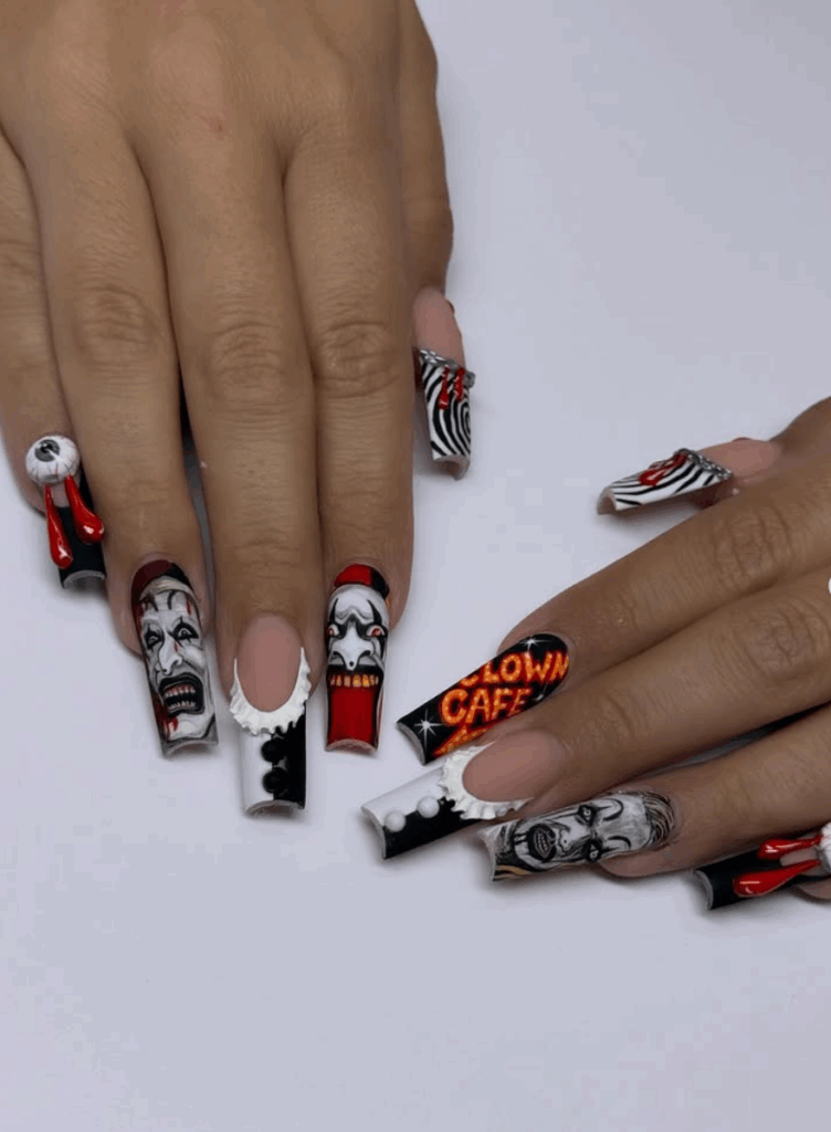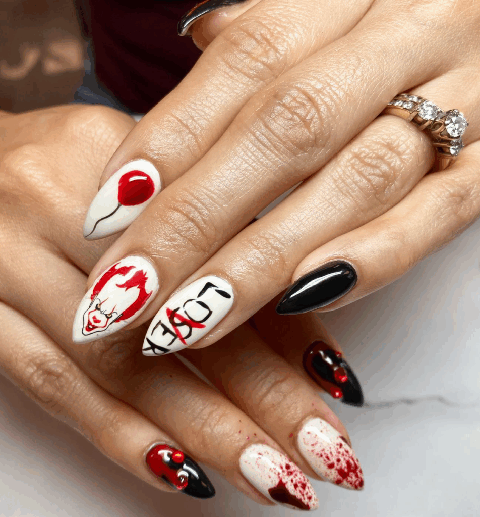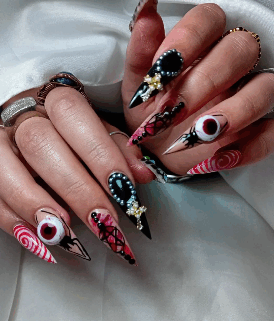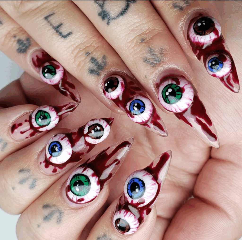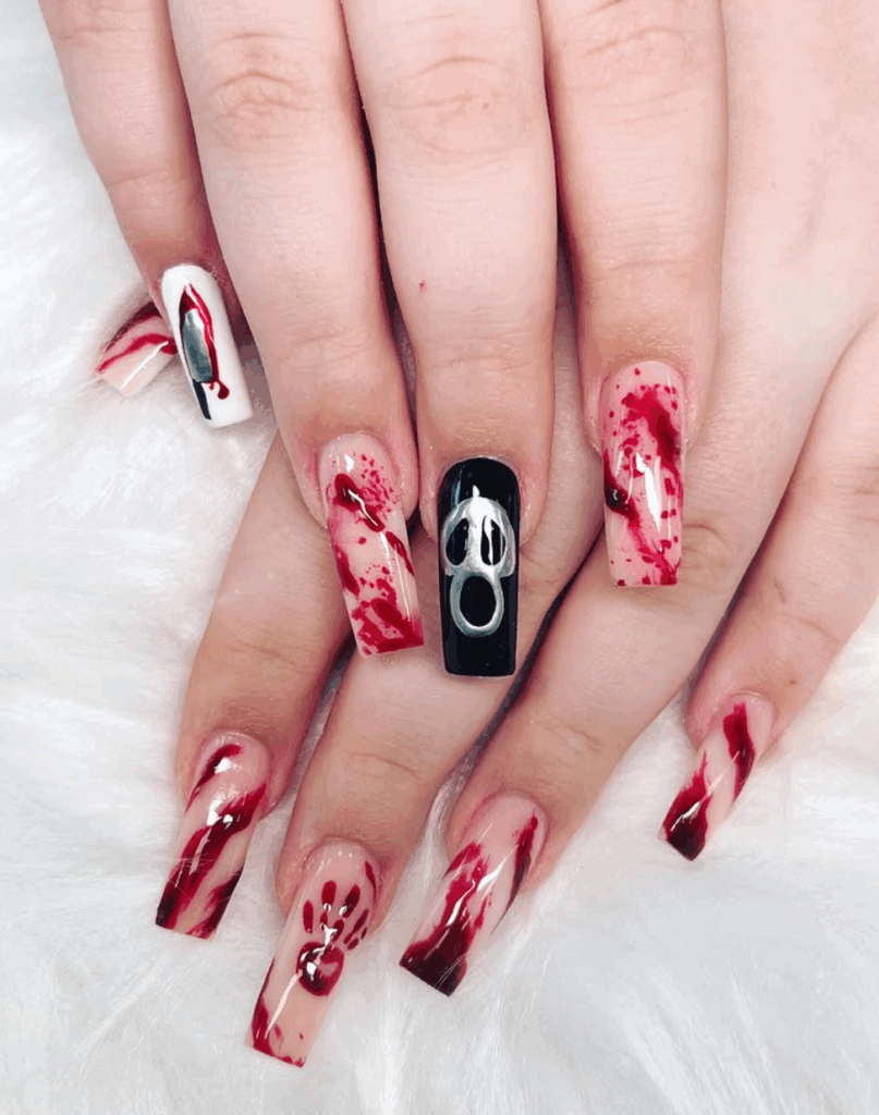 For horror fans, these nails bring the chills. Think skulls, haunted houses, creepy eyes, and red blood-drip designs. They’re bold, dramatic, and perfect for Halloween parties.