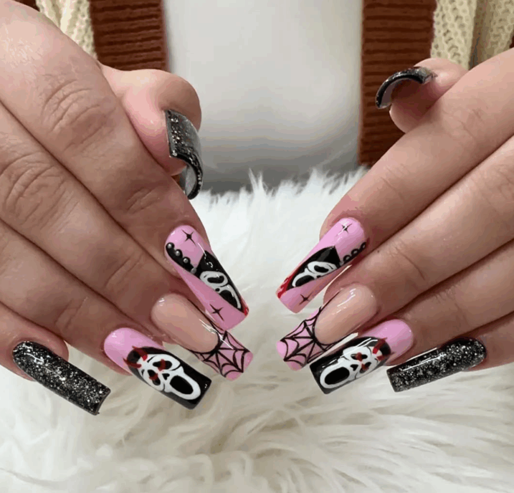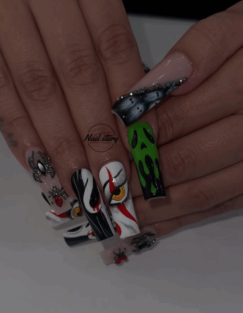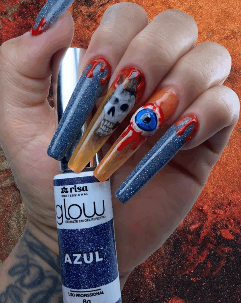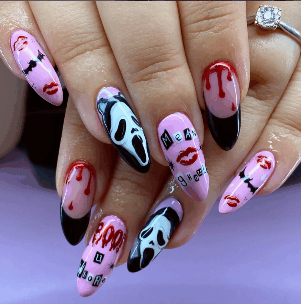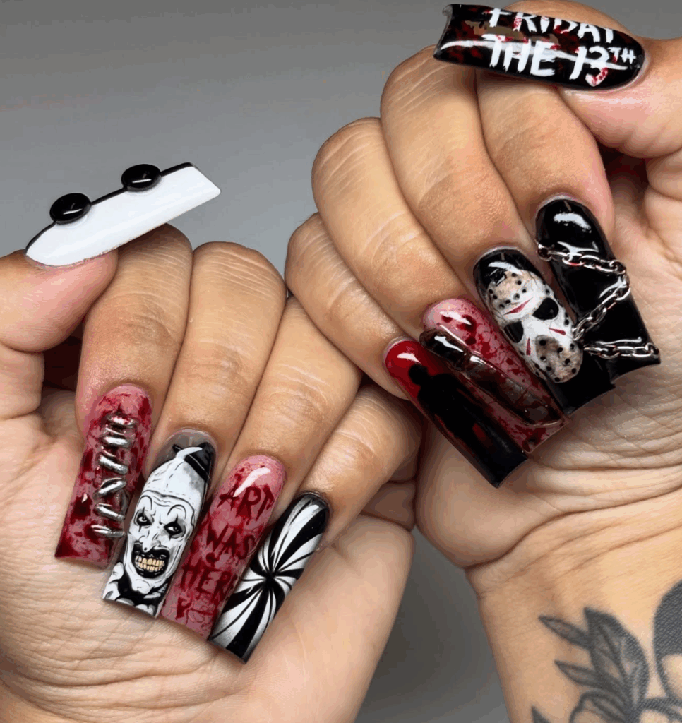 For horror fans, these nails bring the chills. Think skulls, haunted houses, creepy eyes, and red blood-drip designs. They’re bold, dramatic, and perfect for Halloween parties.