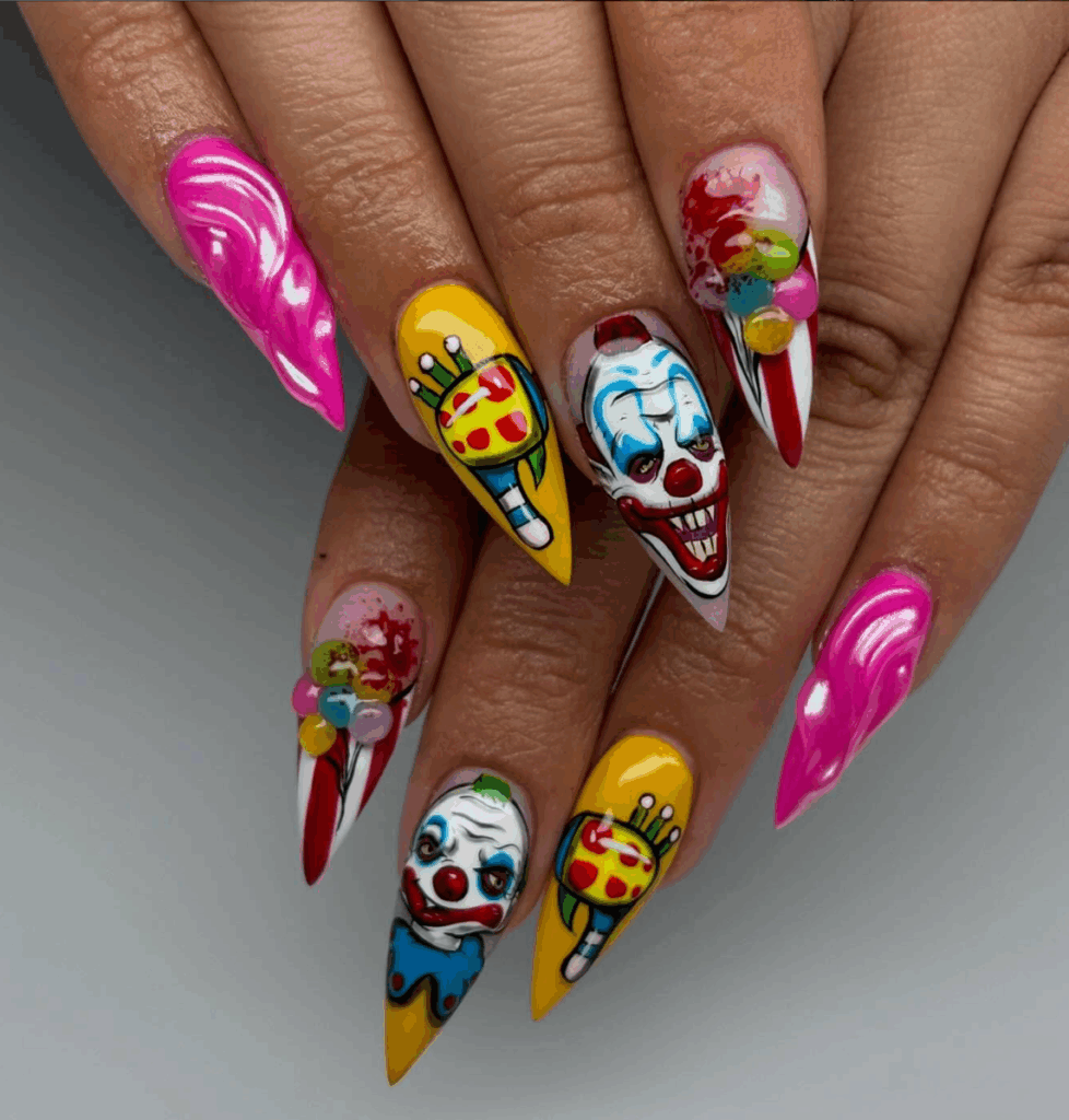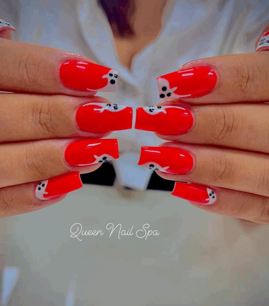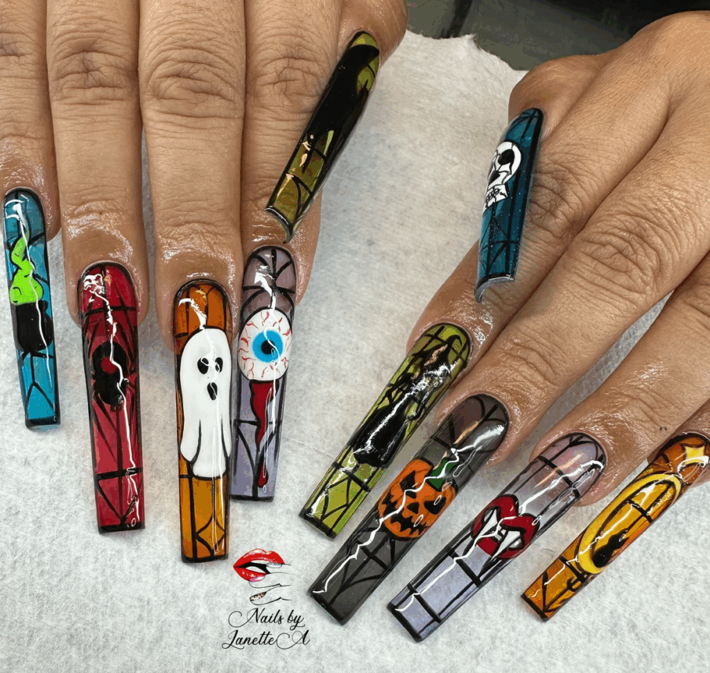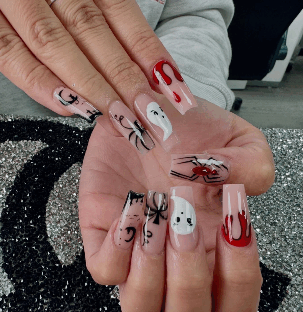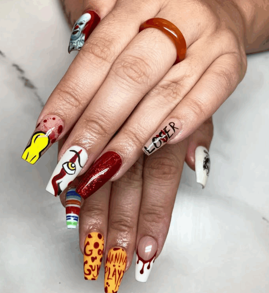 For horror fans, these nails bring the chills. Think skulls, haunted houses, creepy eyes, and red blood-drip designs. They’re bold, dramatic, and perfect for Halloween parties.