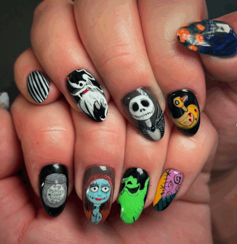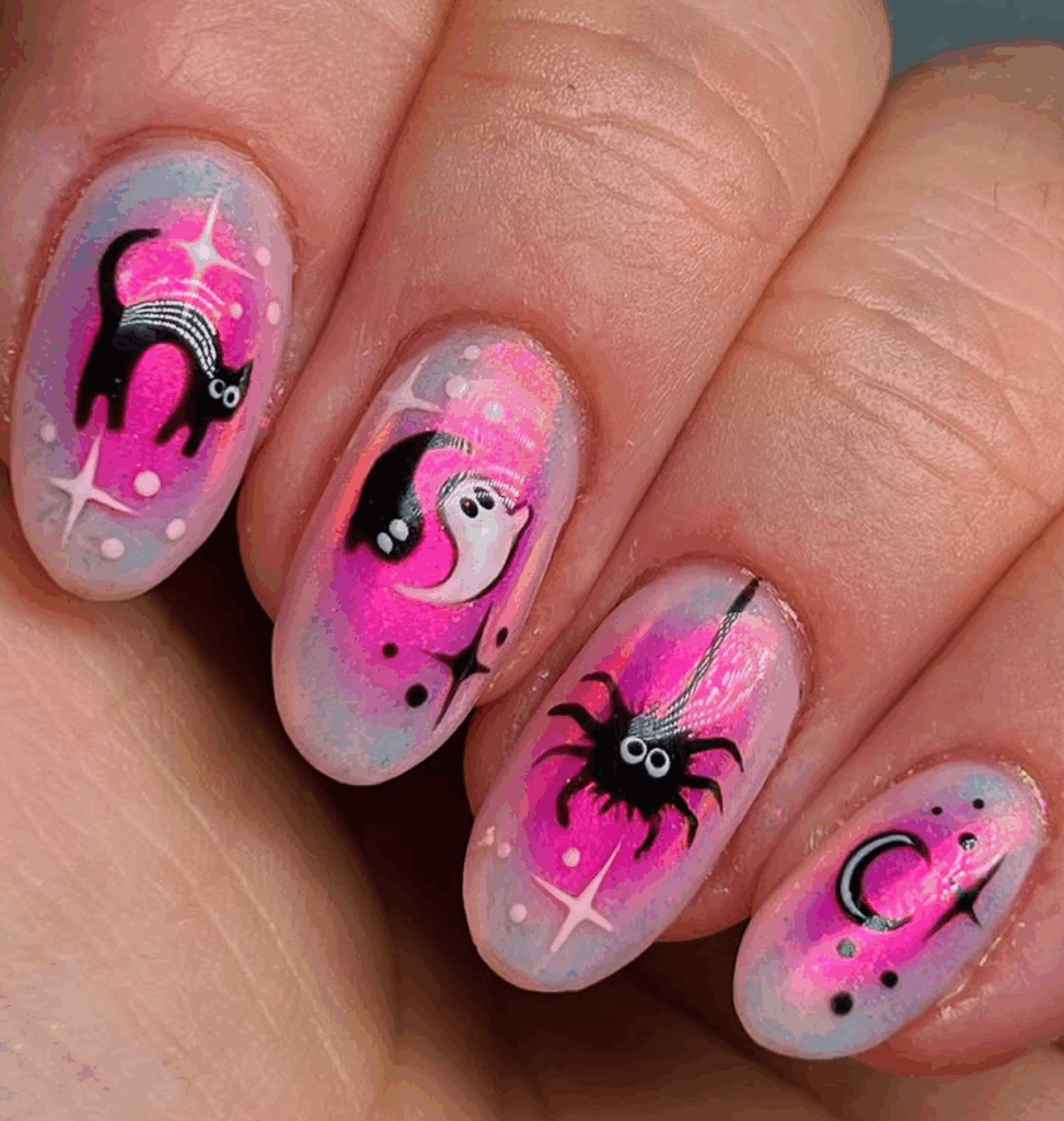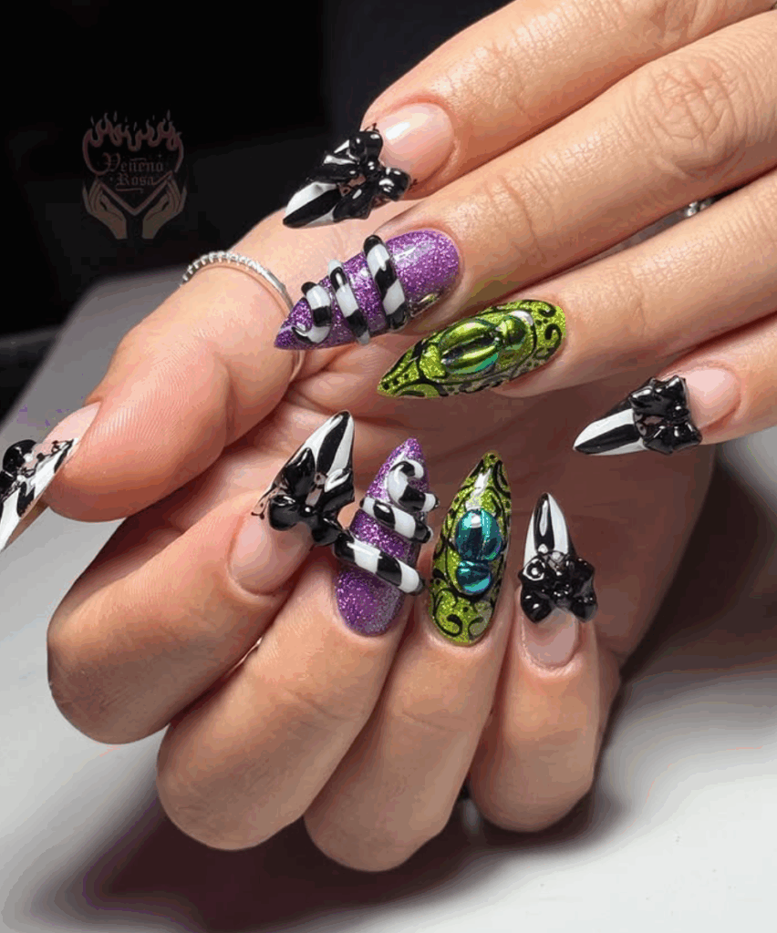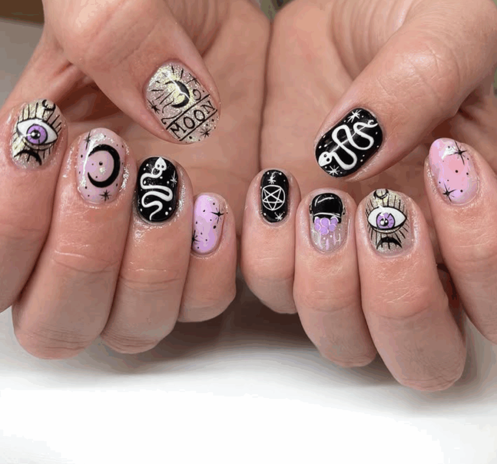 Channel your inner witch with nail designs featuring hats, cauldrons, broomsticks, or even potion-inspired colors like green and purple and more.