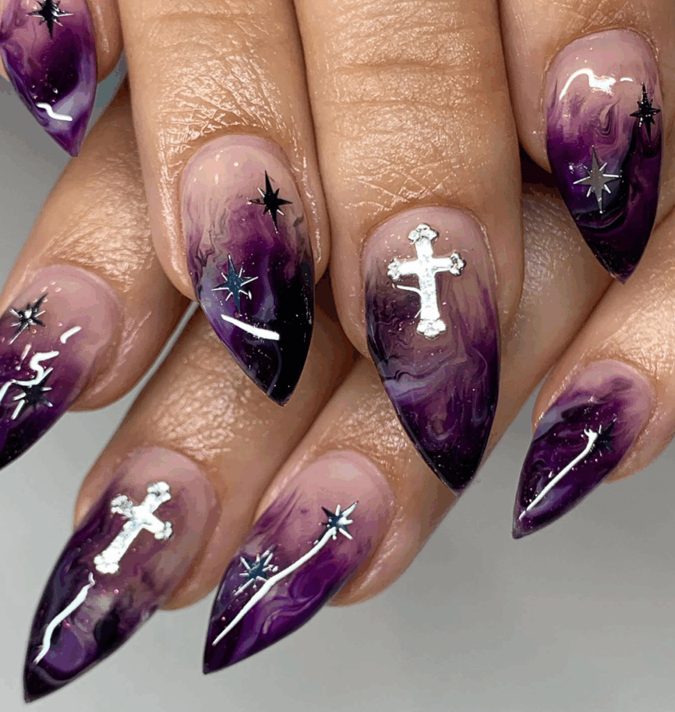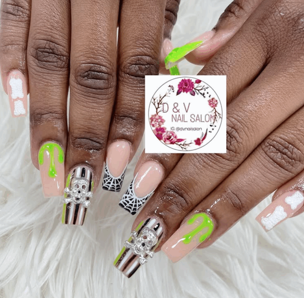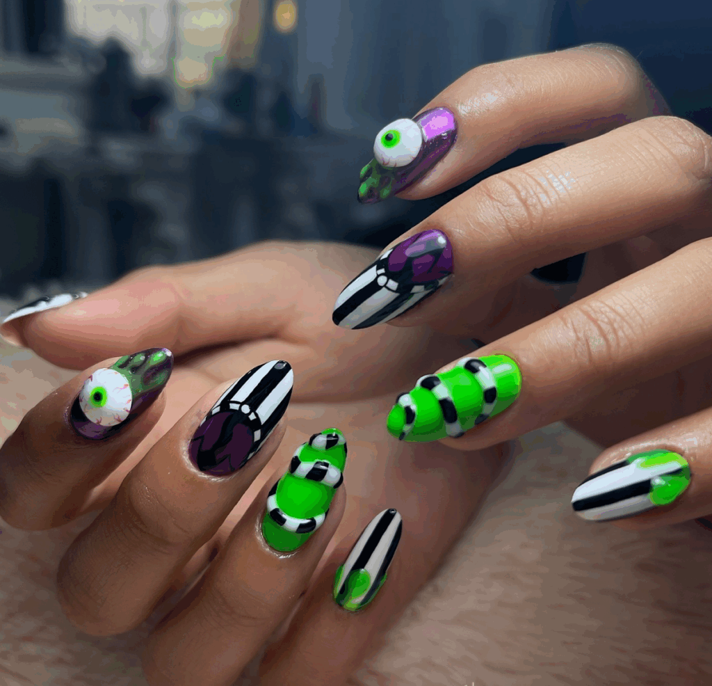 Channel your inner witch with nail designs featuring hats, cauldrons, broomsticks, or even potion-inspired colors like green and purple and more.