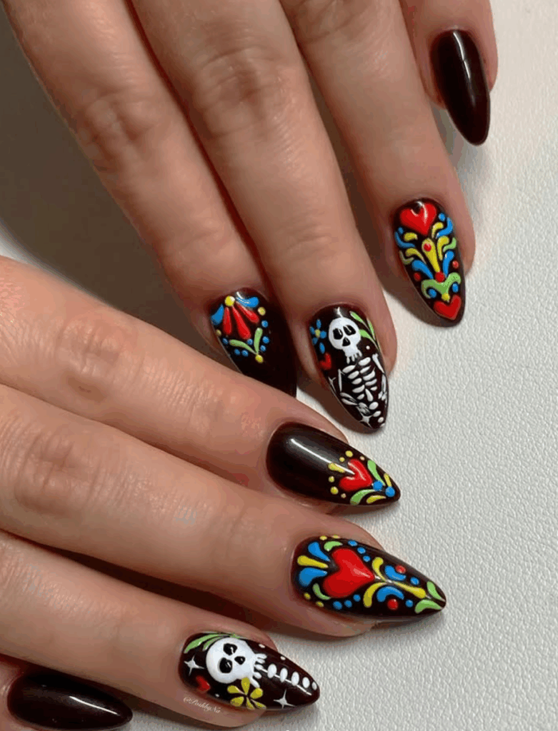 Skeleton-inspired designs range from scary skull art to chic bone outlines. They can be bold and edgy or minimal and elegant.