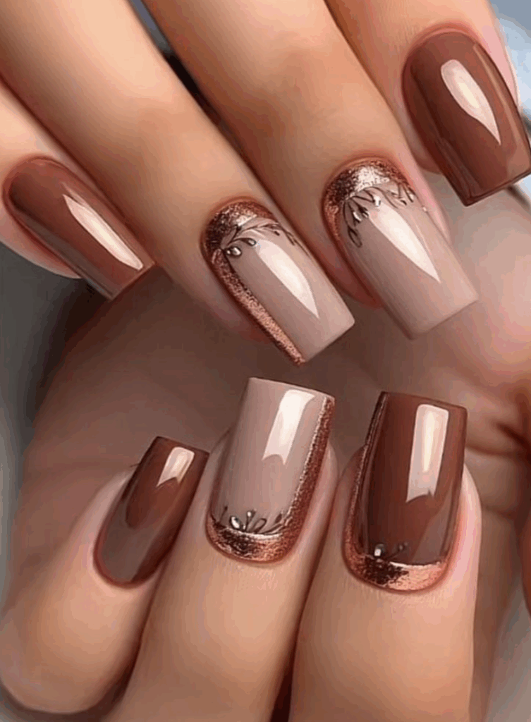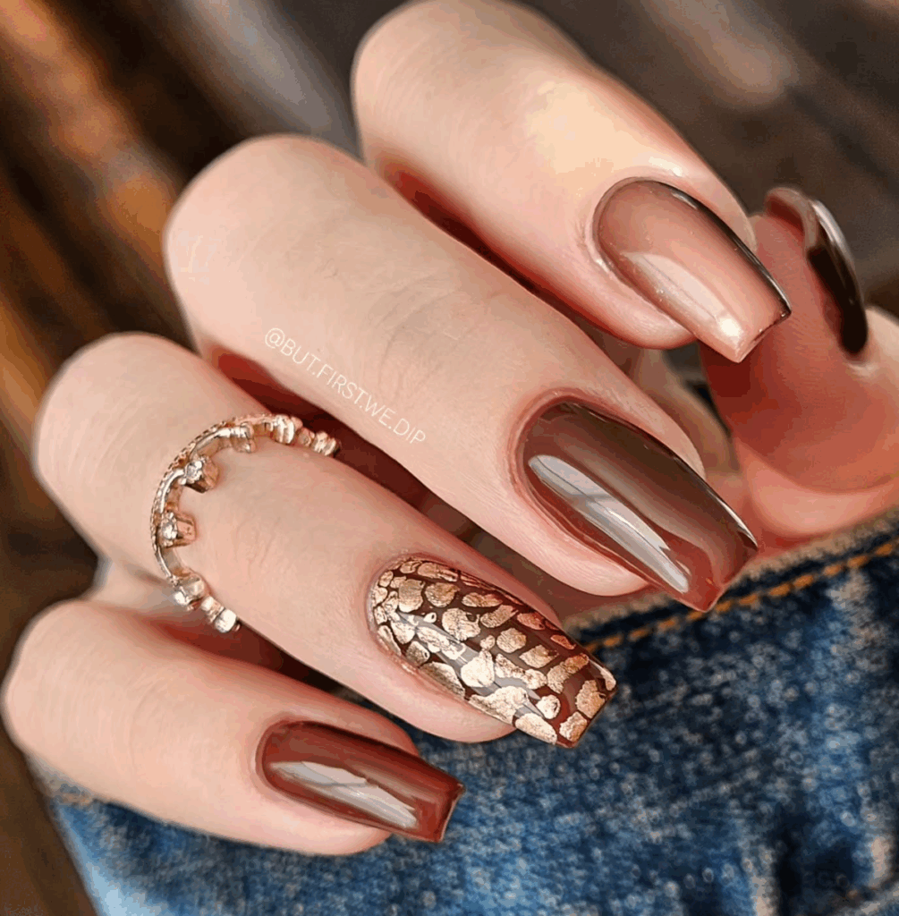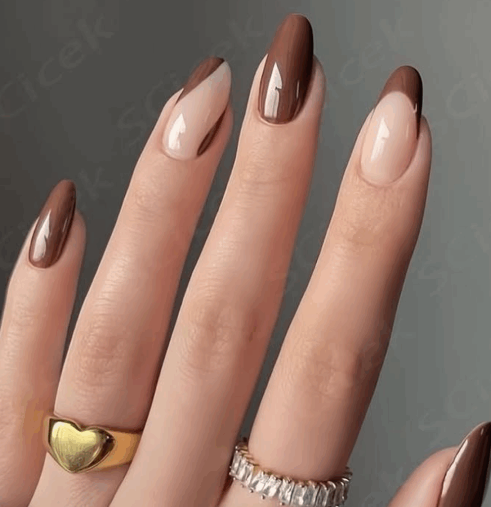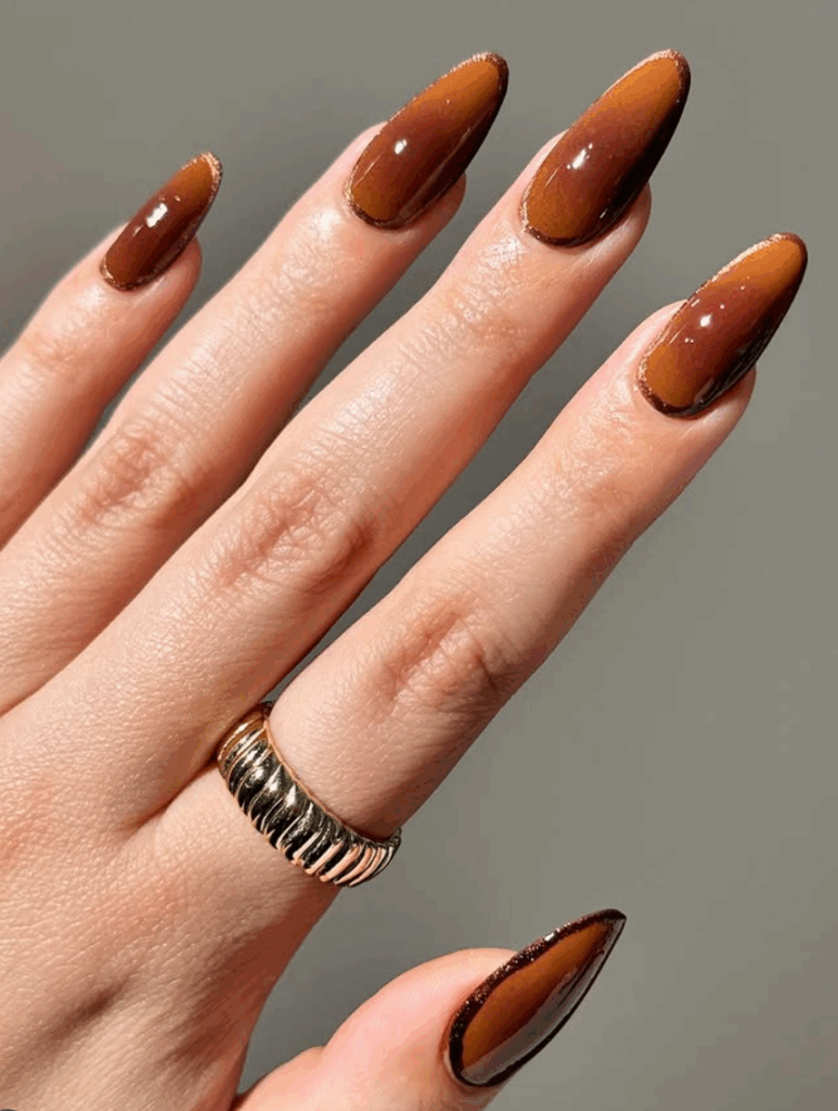 Shades of brown is one of the most trending and chic fall nail colors in 2025. With Mocha Mousse, being the Pantone color of the year, brown has made its way in all aspects of life. From warm caramel and cinnamon tones to rich chocolate and deep espresso shades, brown nails perfectly capture the coziness of autumn. They pair beautifully with fall fashion staples like chunky sweaters, boots, and plaid. Whether you choose a glossy or matte finish, brown nails are a versatile and elegant option for an on-trend autumn manicure.
