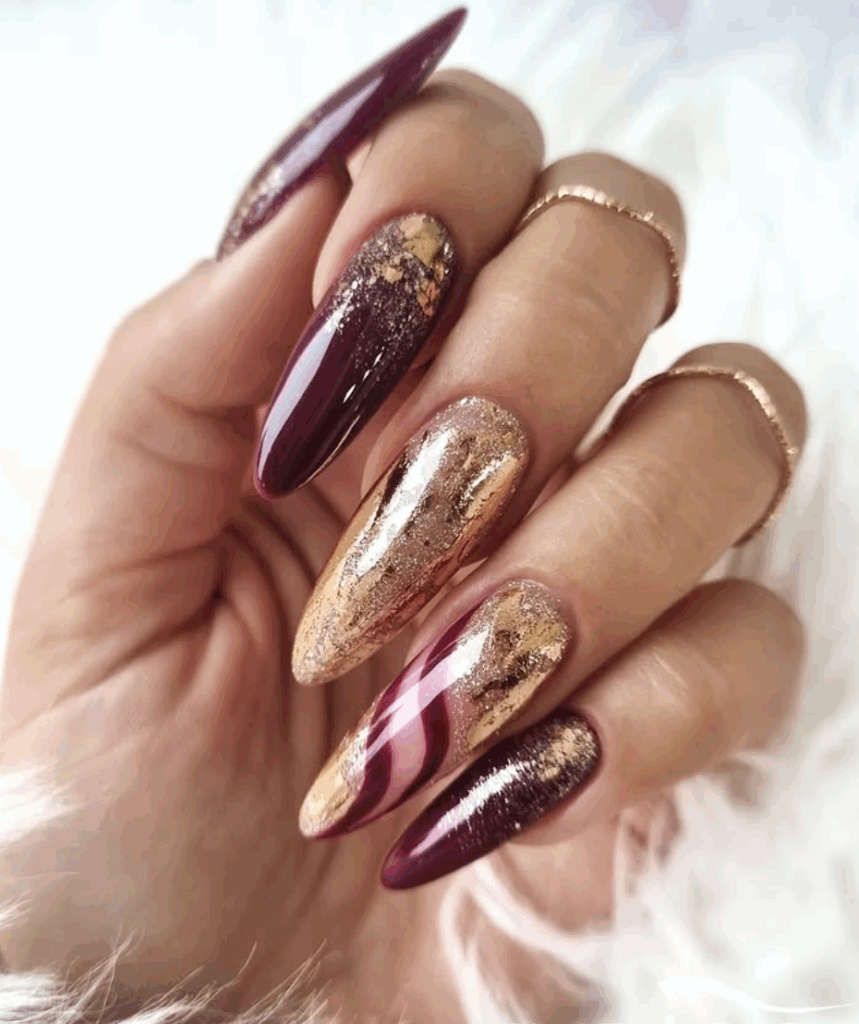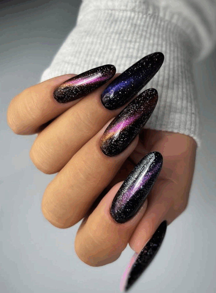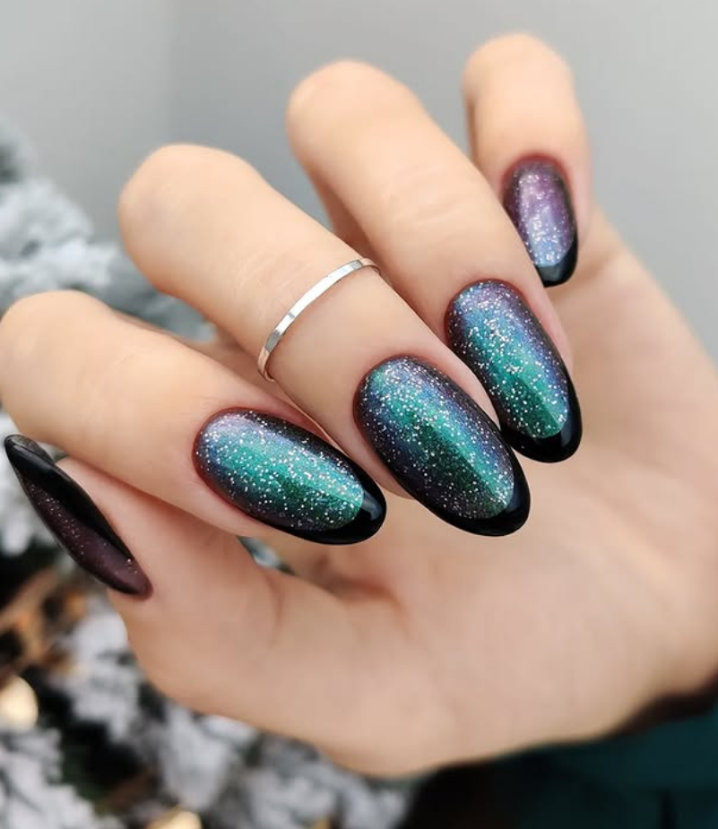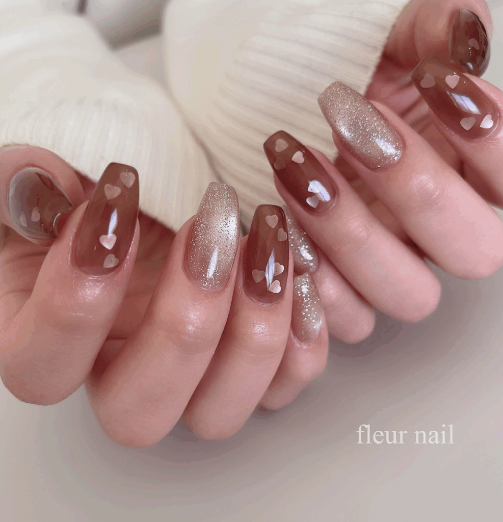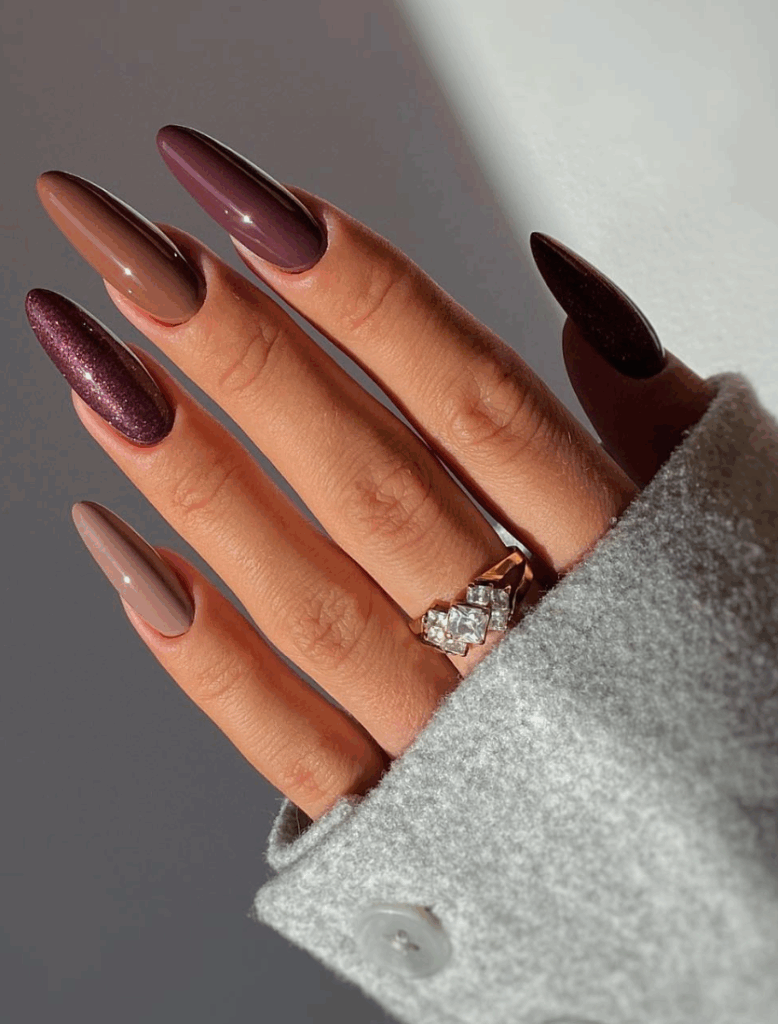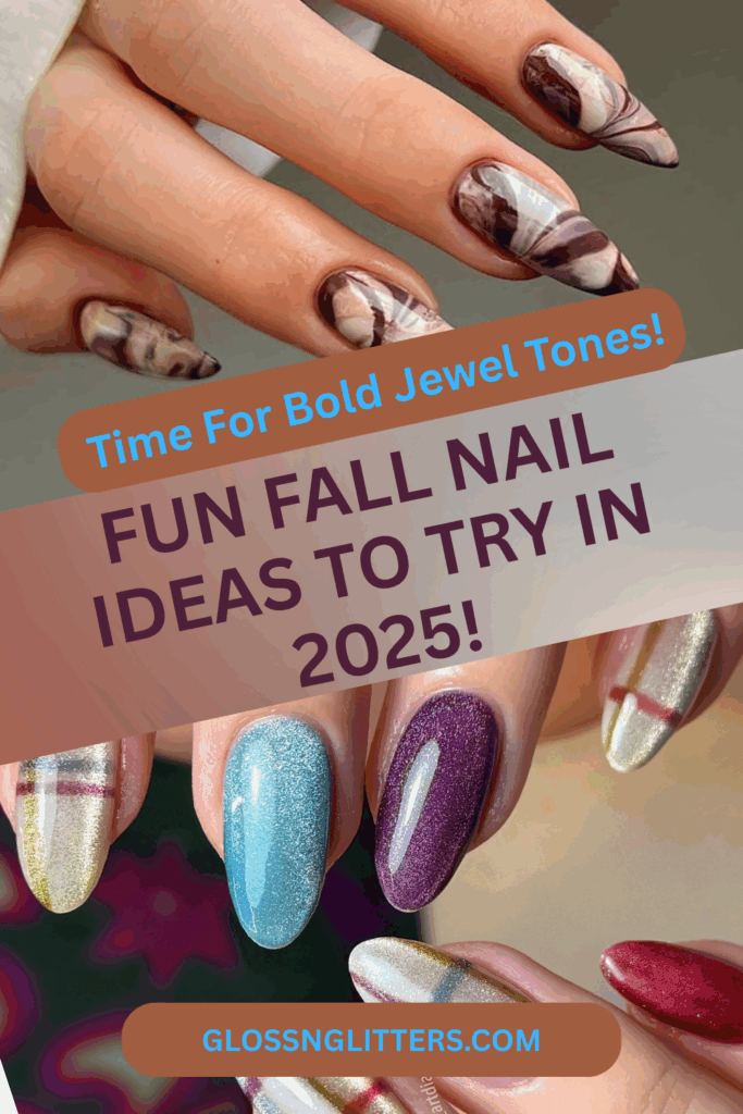 Sparkly glittery nails are a timeless favorite, and fall 2025 is the perfect season to bring out the sparkle. Think golden glitter tips, bronze shimmers, copper sparkles, or even a mix of jewel-toned glitters that match the autumn vibe. Whether you go for a full glitter manicure or subtle glitter accents on nude or dark bases, this trend adds instant glam to your fall look. Glitter nails are especially popular for festive events, holiday parties, and cozy autumn nights when you want your manicure to shine.