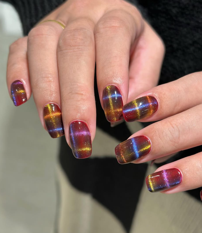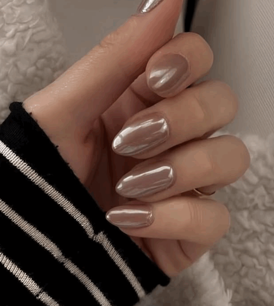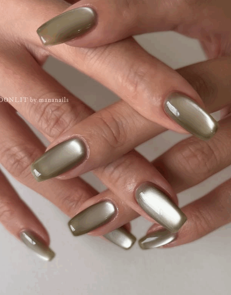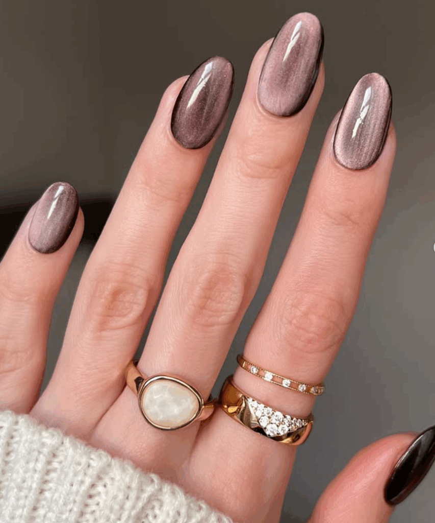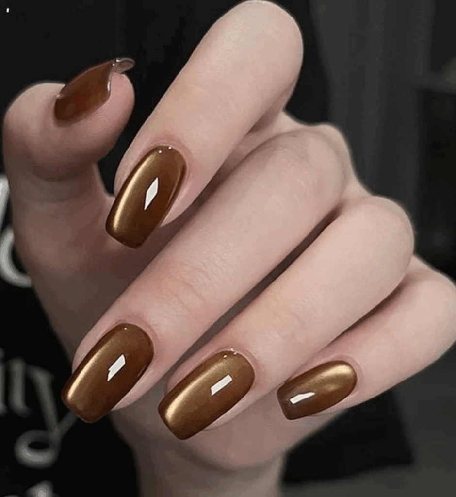 Chrome nails, also called glass nails, are a major nail trend this season. The glossy like mirror finish looks absolutely stunning. Metallic shades like gold, bronze, rose gold, or silver reflect the light beautifully, giving your fall manicure a glamorous edge. The chrome effect is usually created by using magnetic nail polishes or chrome powders. These nails are perfect for autumn nights out, festive events, or when you want a statement-making manicure that stands out.