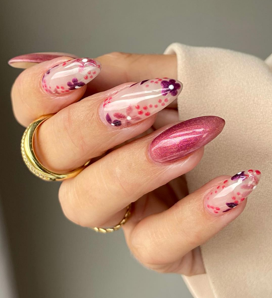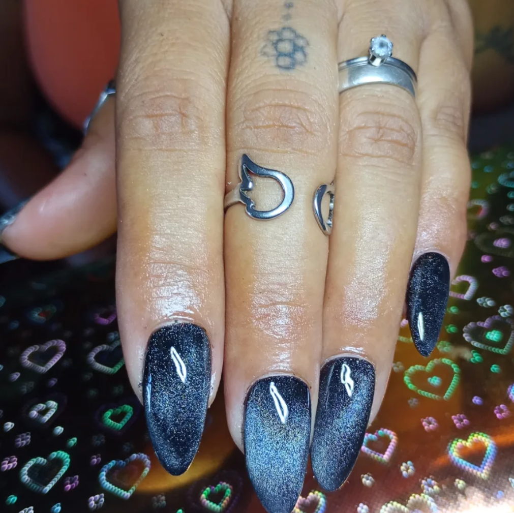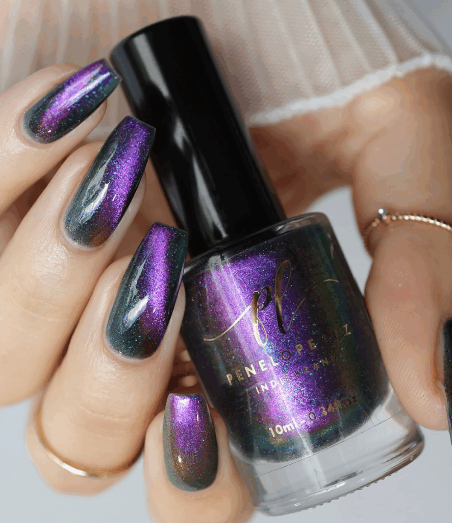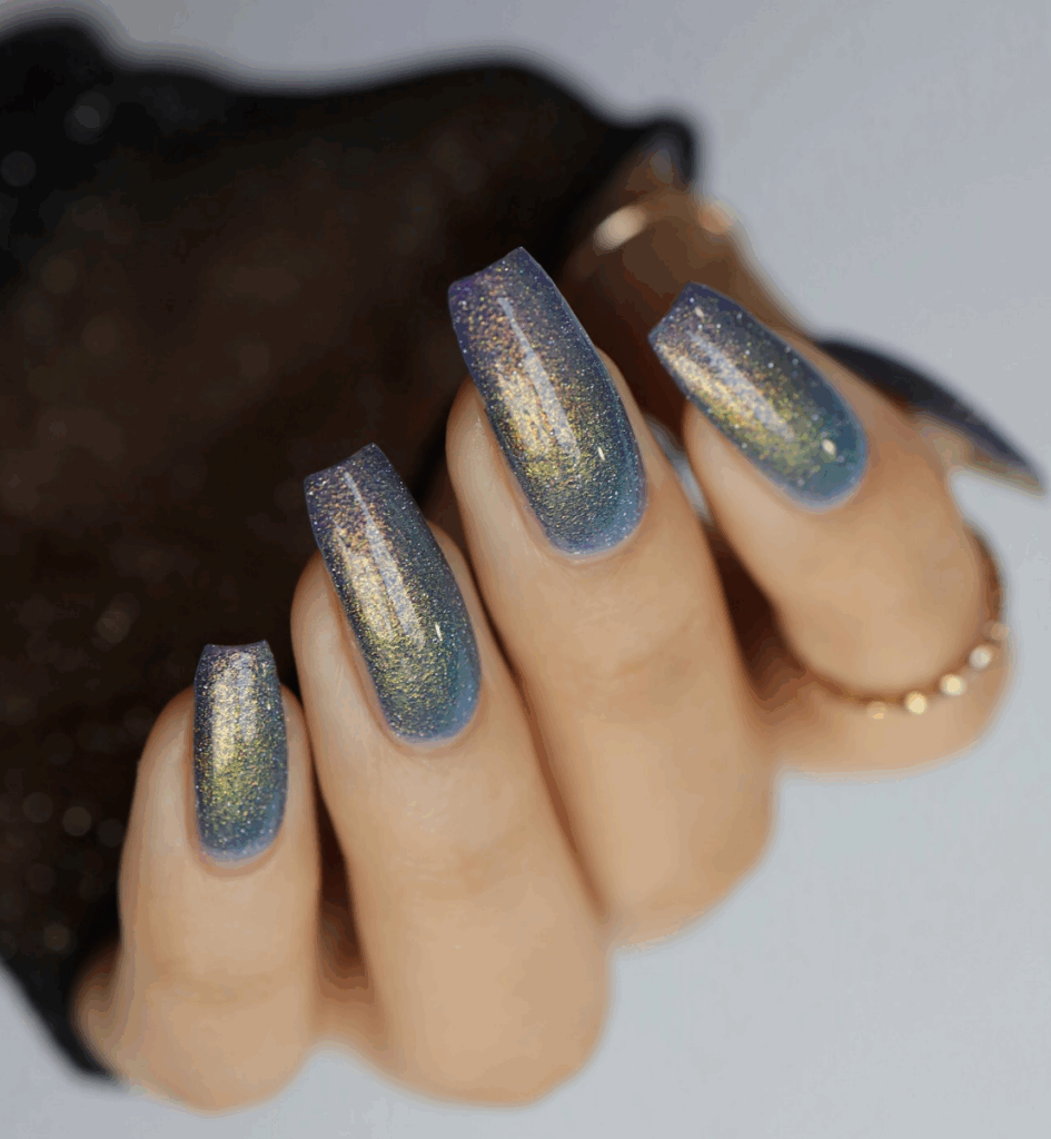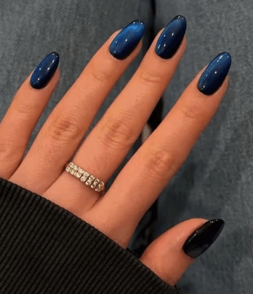 Chrome nails, also called glass nails, are a major nail trend this season. The glossy like mirror finish looks absolutely stunning. Metallic shades like gold, bronze, rose gold, or silver reflect the light beautifully, giving your fall manicure a glamorous edge. The chrome effect is usually created by using magnetic nail polishes or chrome powders. These nails are perfect for autumn nights out, festive events, or when you want a statement-making manicure that stands out.