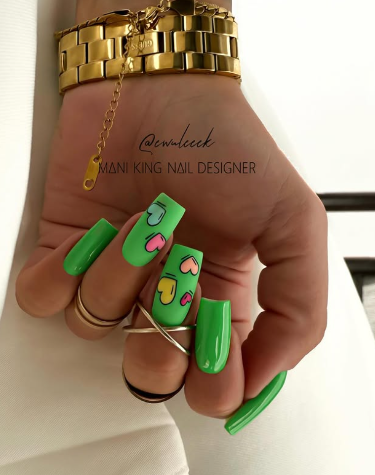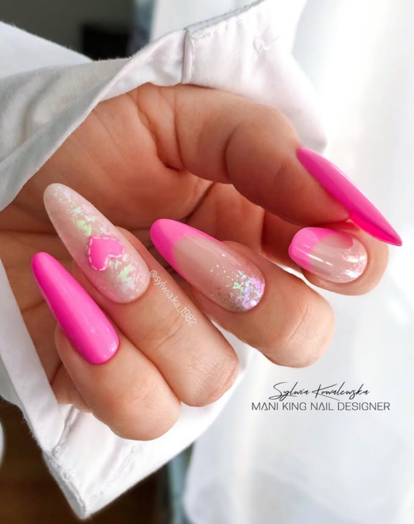 Long bling nails with sparkly hearts, acrylic nails with sequins add extra shine to your day.