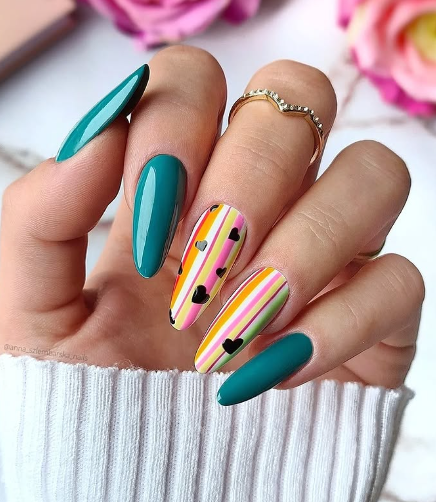 Valentine’s day nail art is very popular. Stripes, tiny heart designs on chrome nails look gorgeous. Below are some unique metallic nail designs, glass nails, nail art design for short nails, even blue nails, black and white nails are eye catching and many more Valentine’s day nail ideas that you will fall in love.